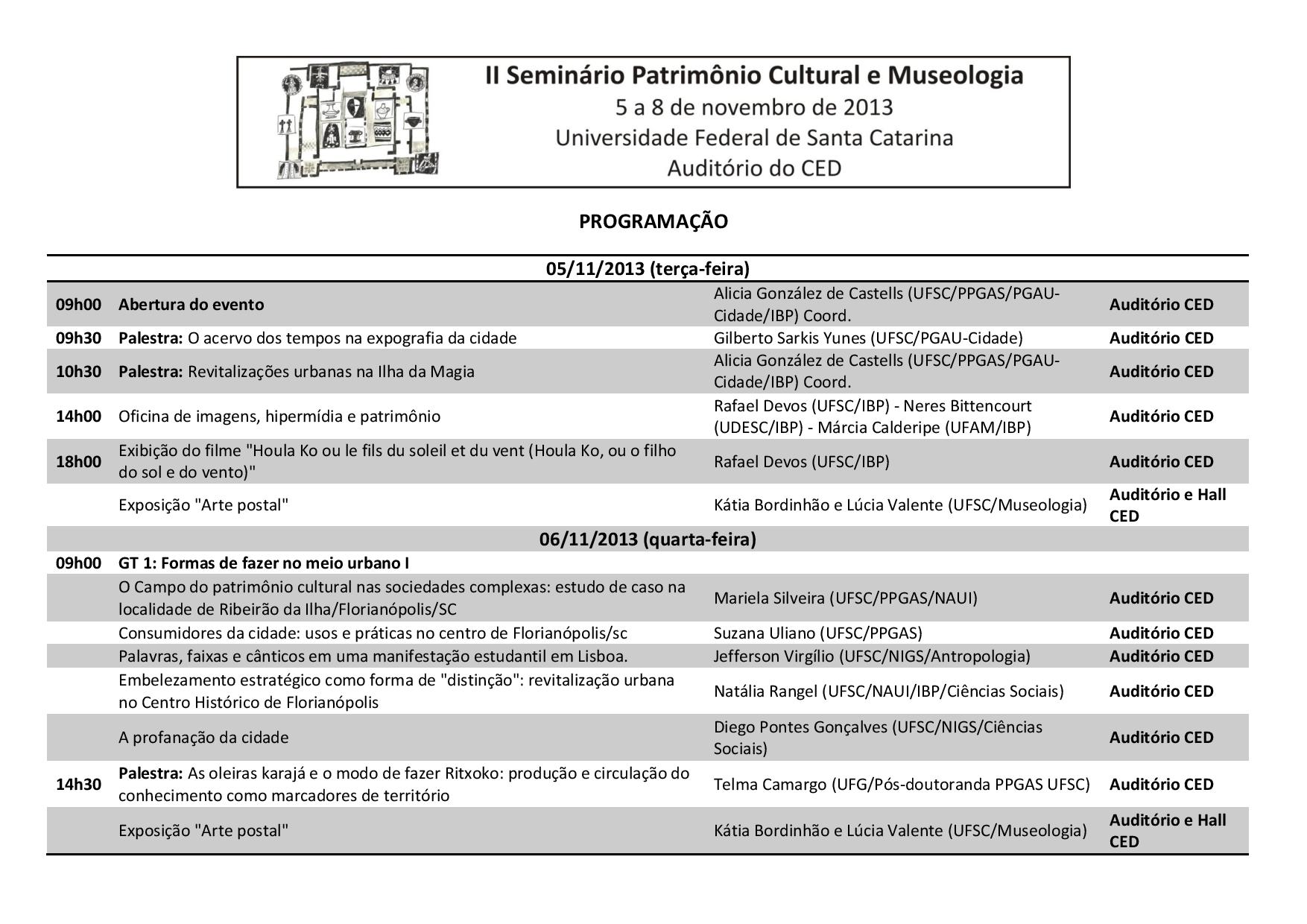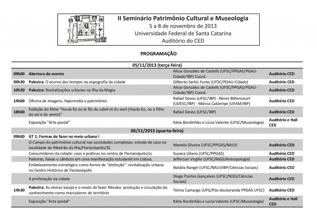 O Núcleo de Dinâmicas Urbanas e Patrimônio Cultural (NAUI) da UFSC promoverá o 2º Seminário Patrimônio Cultural e Museologia, entre os dias 5 e 8 de novembro, no auditório do Centro de Ciências da Educação (CED), com apoio do Programa de Pós-Graduação em Antropologia Social (PPGAS), do Instituto Nacional de Pesquisa Brasil Plural e do Programa de Pós-Graduação em Urbanismo, História e Arquitetura da Cidade (PGAU-Cidade). O evento é gratuito e aberto ao público. Não é necessário efetuar inscrição.