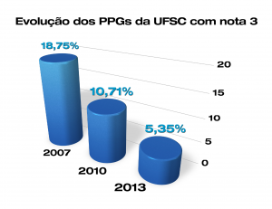 Dos 56 programas de Pós-Graduação da Universidade Federal de Santa catarina (UFSC) avaliados pela Capes, 17 alcançaram as notas 6 e 7, as mais altas concedidas pela agência, referendando os cursos como de excelência internacional. Na última avaliação trienal, cujos resultados foram divulgados no dia 10 de dezembro, a Universidade mais que dobrou o número de programas com nota 6 – eram 7, em 2010, e agora são 15, o que equivale a 26,78% dos programas da instituição.