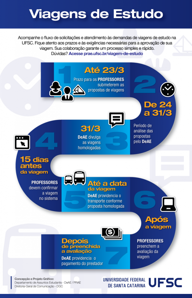 O DeAE alerta, ainda, que os professores avaliem as viagens em até 48 horas após sua realização. O formulário de avaliação está disponível no site da PRAE e, após preenchido, deve ser encaminhado ao e-mail deae@contato.ufsc.br.