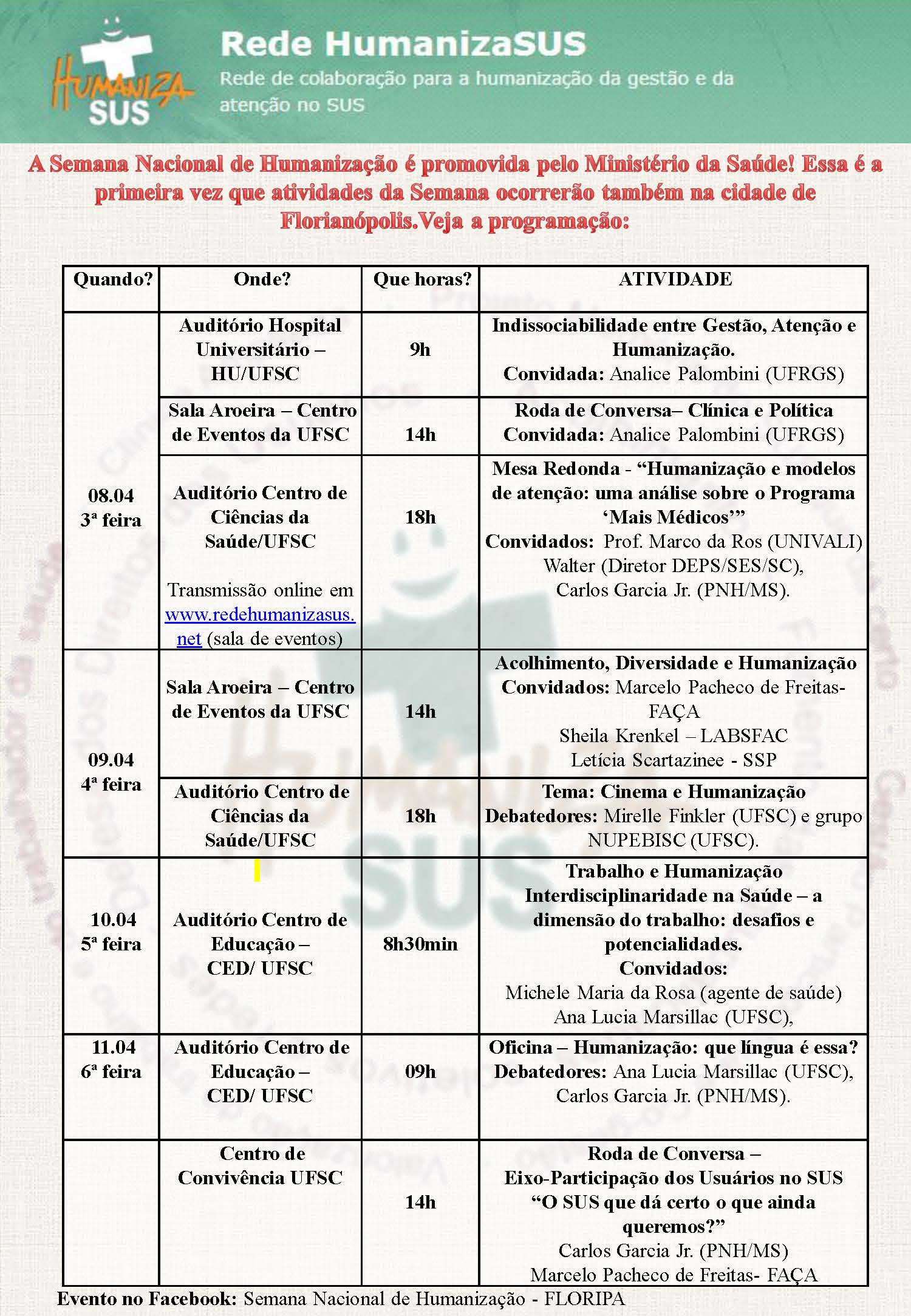 A Semana Nacional de Humanização na Saúde será realizada de 8 a 11 de abril na Universidade Federal de Santa Catarina (UFSC). A Semana foi organizada em parceria com o Ministério da Saúde, a Secretaria de Estado da Saúde de Santa Catarina, Secretarias Municipais de Saúde de diversos municípios catarinenses e instituições de saúde e universidades no nosso estado. Tem por objetivo o diálogo sobre as políticas e práticas de saúde, em especial, no âmbito do Sistema Único de Saúde (SUS) como estratégia de dar visibilidade às potencialidades e fragilidades da questão saúde na sociedade brasileira. Tal iniciativa marca também o Dia Mundial da Saúde comemorado em 7 de abril.