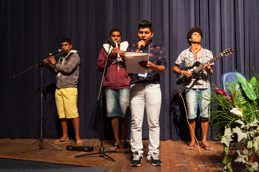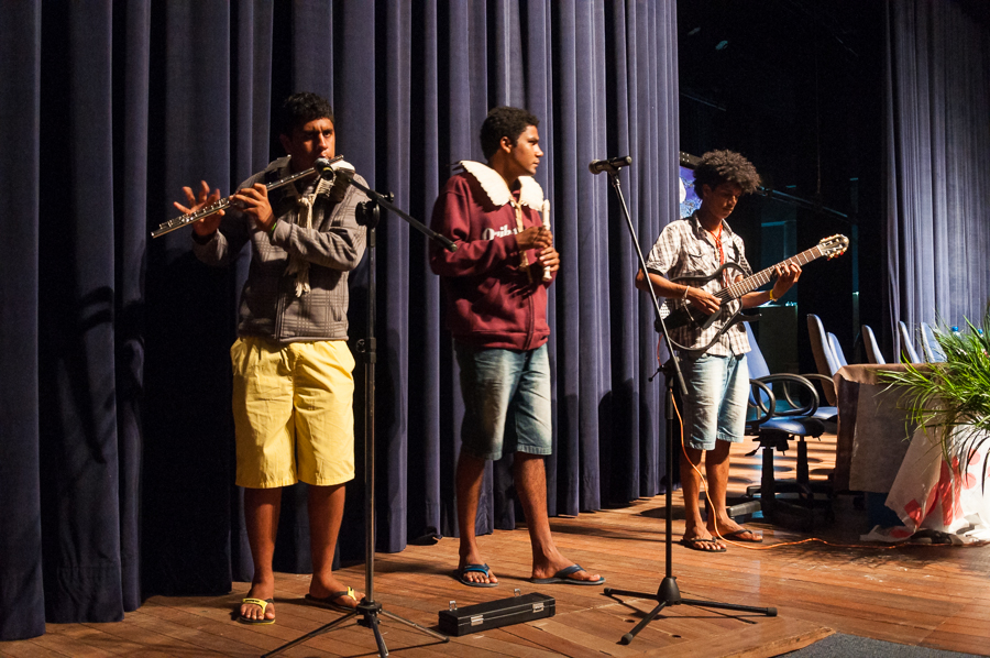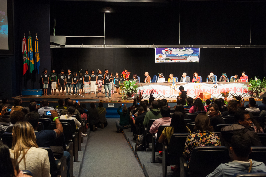 Após a composição da mesa, o Hino Nacional foi executado por músicos kaingang em duas versões: português e kaingang. Em seguida, o Coral do Povo Indígena Guarani se apresentou e mostrou uma abordagem diferente, mântrica e espaçada, no tempo e estrutura da música. Primeiro da mesa a falar, o coordenador do evento, Paulo Capela, elogiou a iniciativa de trazer para a UFSC o evento. O representante do Articulação dos Povos Indígenas do Brasil (Apib), Dinaman Tuxá, observou que “ninguém veio para brincar, se divertir ou a passeio. Viemos para construir políticas de permanência na Universidade”. Ana Patté, graduada da UFSC em Licenciatura Intercultural Indígena e integrante da comissão organizadora do evento, disse: “Temos que ser protagonistas da nossa história”. Edinaldo Xukuru, representante da Universidade Federal de São Carlos (SP), que sediou o primeiro Enei, considerou que o movimento teve avanços, mas ainda são muitos os desafios. Simone Eloy, da Universidade Católica Dom Bosco, de Campo Grande (MS), onde foi realizado o segundo encontro, falou da importância de que “a universidade se pinte de povo, não o povo se pinte de universidade”.