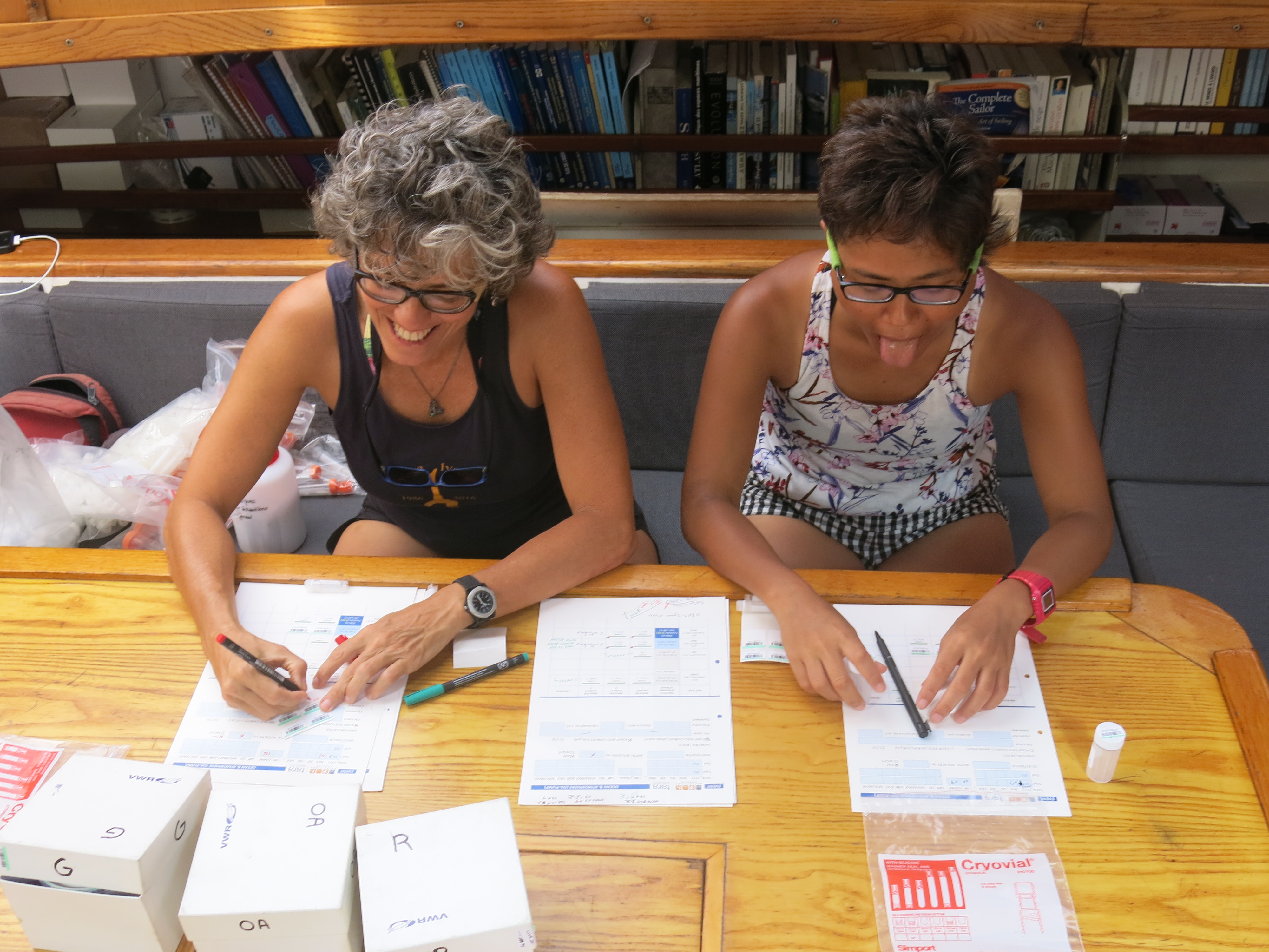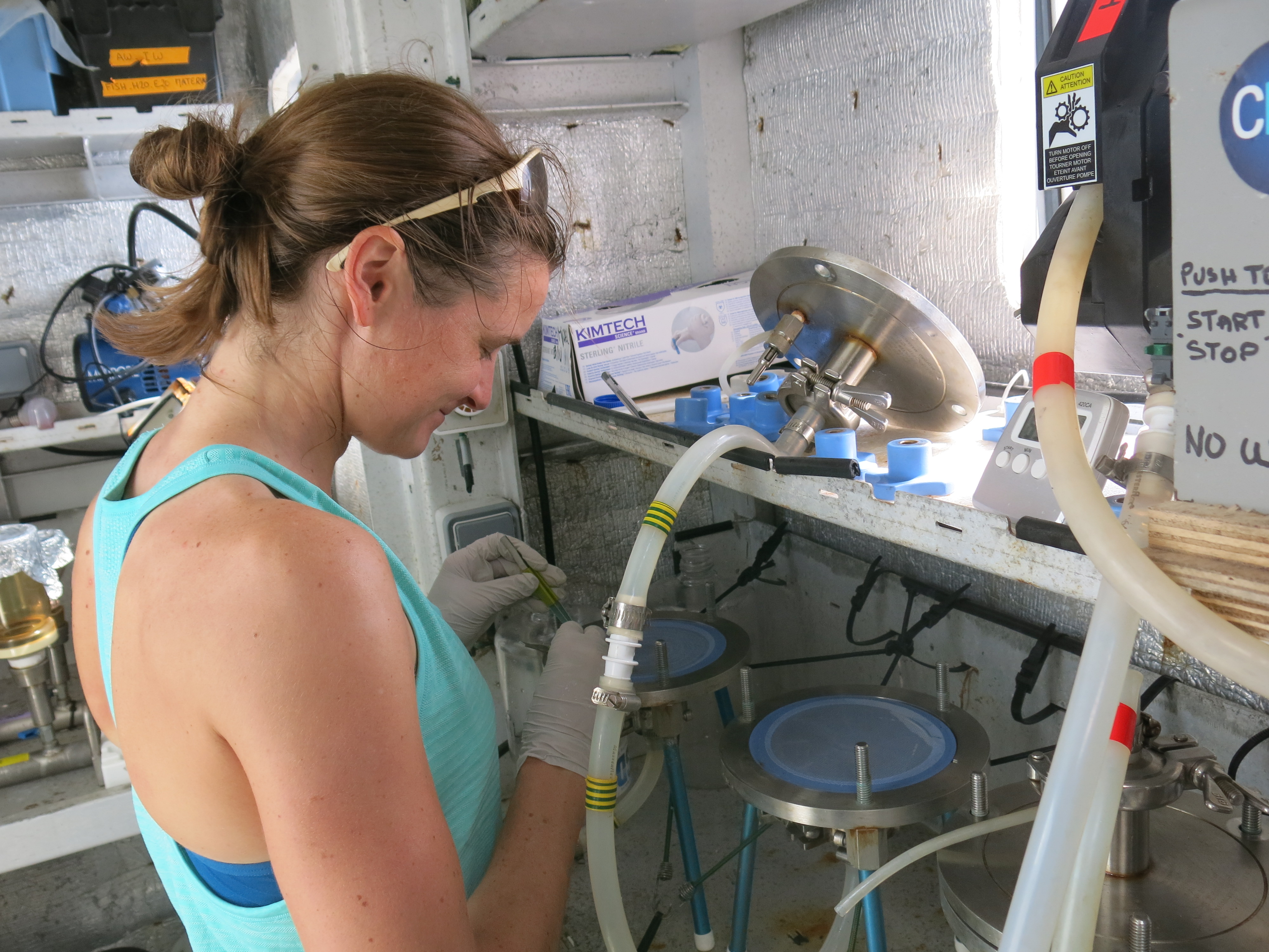 Durante a expedição, que ocorreu em maio deste ano, a pesquisadora era responsável por toda a filtração de água no laboratório instalado no convés da embarcação. “A água do mar passava por vários filtros diferentes, para identificarmos bactérias, vírus, protista (microorganismos como a ameba), fitoplâncton e zooplâncton. Esses indivíduos serão depois analisados por morfologia, biologia molecular, citometria de fluxo etc. O material era armazenado de diferentes formas e utilizávamos protocolos técnicos complicados, que eu conhecia apenas da leitura de artigos da Science e da Nature. Tive a chance de ver como isso é feito realmente. Esses artigos são uma caixa preta, por isso foi tão importante conhecer os procedimentos desses protocolos e aprender como são realizados”, relata Andrea.
