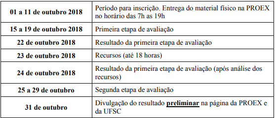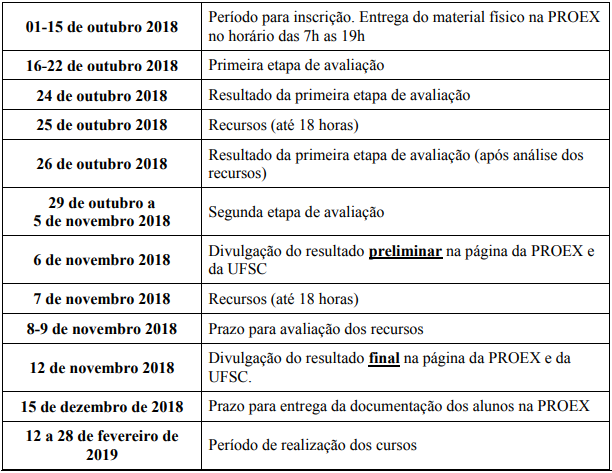 Para participar, os cursos devem respeitar os requisitos de organização e planejamento, com carga horária mínima de 30 horas, e podem ser ministrados em qualquer idioma. As aulas serão realizadas entre os dias 12 e 28 de fevereiro de 2019, por isso, a preferência de que o curso seja realizado em uma semana intensiva. Confira abaixo o cronograma do processo de inscrição e resultados: