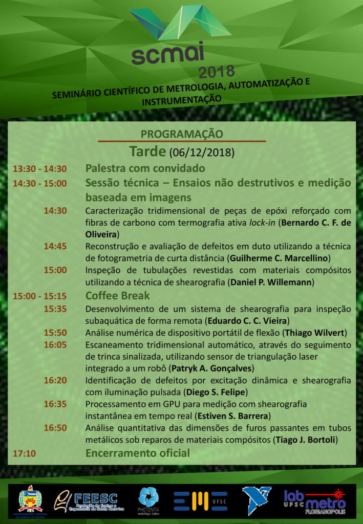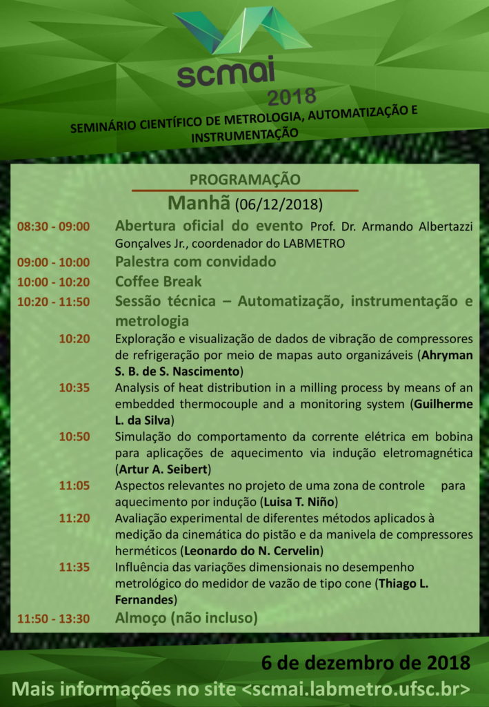 O Laboratório de Metrologia e Automatização (Labmetro) da Universidade Federal de Santa Catarina (UFSC) realizará a primeira edição do Seminário Científico de Metrologia, Automatização e Instrumentação (SCMAI 2018), evento que ocorrerá no dia 6 de dezembro, no Auditório do Departamento de Engenharia Elétrica e Eletrônica da UFSC (Auditório Teixeirão), no Campus de Florianópolis. São esperadas 100 pessoas, entre alunos e professores da instituição, bem como integrantes de outras instituições e profissionais da área, atuantes nos setores público e privado.