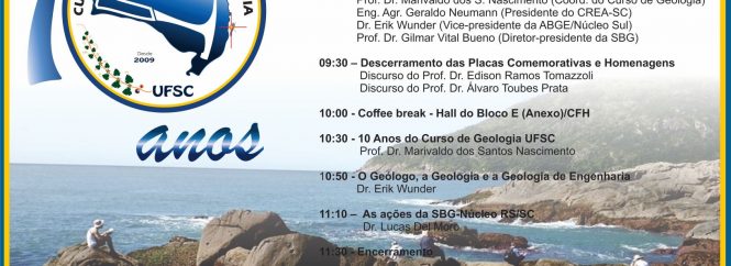 O Departamento de Geologia da Universidade Federal de Santa Catarina (DGL/UFSC) celebra nesta sexta-feira, 13 de setembro, a partir das 9 horas, no Auditório do Bloco E do Centro de Filosofia e Ciências Humanas (CHF), os 10 anos de criação do curso de graduação em Geologia da UFSC. Dentre os atos de celebração está o descerramento da Placa … Continue lendo Curso de Geologia da UFSC celebra 10 anos de criação nesta sexta, 13
