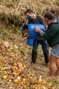 Regis Scaggiante, fundador da Ong Terra Orgânica e Indianara trabalham na montagem da composteira na Horta Nova Descoberta. (Foto: Divulgação)