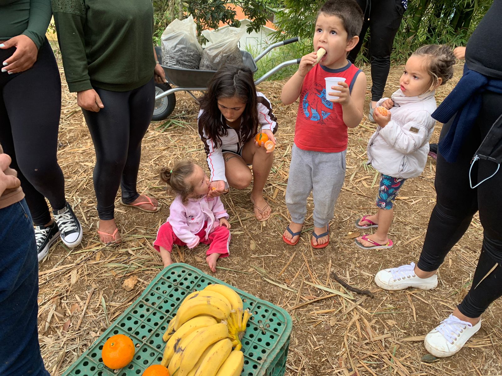 Crianças da comunidade comendo frutas levadas pela professora Thaise para o dia de mutirão na Horta (Foto: Arquivo Pessoal)