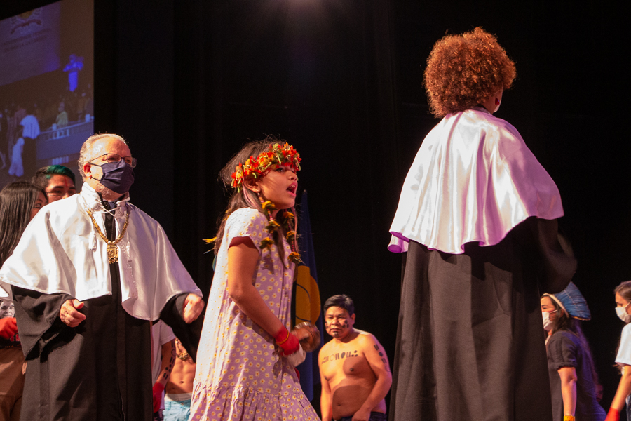 Com muitos aplausos, música e uma apresentação cultural e ancestral de estudantes indígenas, o professor Irineu Manoel de Souza e a professora Joana Célia dos Passos participaram da sessão solene de transmissão do cargo de reitor, realizada nesta sexta-feira, 8 de julho, no Centro de Cultura e Eventos da Universidade Federal de Santa Catarina (UFSC). Desde segunda-feira, 4 de julho, eles estão à frente da gestão da UFSC, após serem escolhidos em consulta informal à comunidade universitária, referendados pelo Conselho Universitário e nomeados em ato presidencial. O mandato, que tem duração de quatro anos, foi transmitido pelos professores Ubaldo Cesar Balthazar e Cátia Regina Silva de Carvalho Pinto.