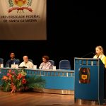 Por fim, o reitor Irineu Manoel de Souza saudou as homenageadas e os demais presentes e realizou a fala de encerramento da solenidade. “Este momento memorável dos 64 anos da nossa UFSC é de muitas alegrias para nossa comunidade universitária. São sentimentos fortes de responsabilidade em meio a muitos desafios. Celebrar os 64 anos da UFSC é, principalmente, agradecer. Agradecer a todas as pessoas que contribuíram para a Universidade que temos hoje. Temos uma universidade multicampi, que leva educação pública e de qualidade, além de Florianópolis, para os municípios de Araranguá, Blumenau, Curitibanos e Joinville. Parabéns à comunidade da Universidade Federal de Santa Catarina ontem, hoje e sempre. Viva a UFSC!”
