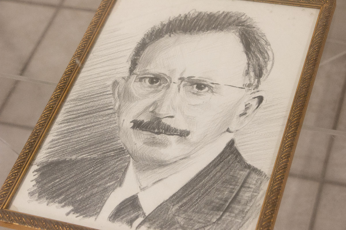 Retrato de Franklin Cascaes integrante da exposição “Franklin Cascaes: vida e arte em tela”, na Biblioteca Central da UFSC. Foto: Gustavo Diehl/Agecom/UFSC