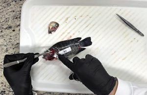 Coleta de material para análise de exemplar de tilápia do Nilo. Foto: Divulgação/Laboratório Aquos/UFSC