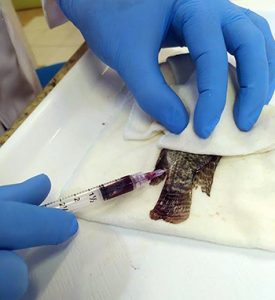 Coleta de sangue de exemplar de tilápia do Nilo para análise. Foto: Divulgação/Laboratório Aquos/UFSC