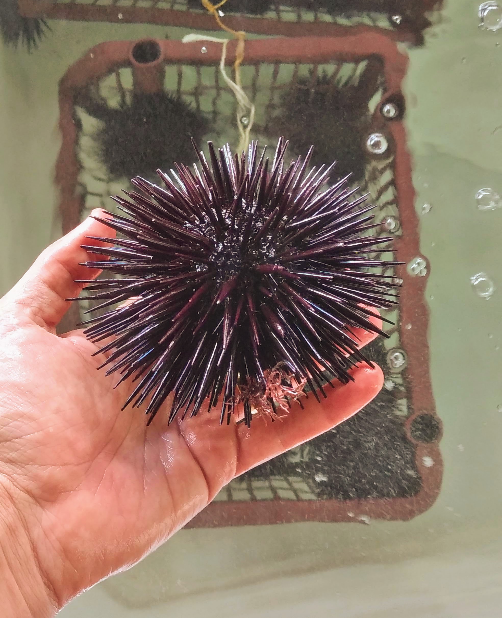 Reprodutor de Echinometra lucunter utilizado nos protocolos experimentais para o desenvolvimento da tecnologia de produção larval e juvenil em aquicultura. Foto: Divulgação LMM/UFSC