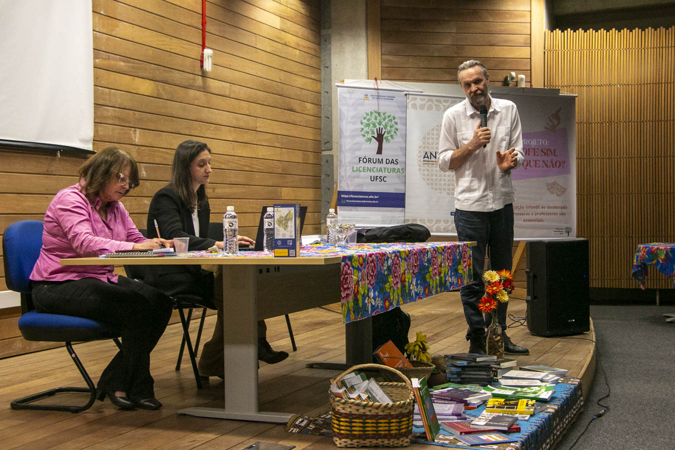 A mesa de abertura foi conduzida pela coordenadora do Comitê Gestor do Fórum das Licenciaturas da UFSC, Carolina Cherfem. Entre os participantes, estavam o reitor da UFSC, Irineu Manoel de Souza; a pró-reitora de Graduação e Educação Básica (Prograd), Dilceanne Carraro; o coordenador de Educação Básica, George Luiz França; a professora emérita e secretária-geral da Associação Nacional pela Formação dos Profissionais da Educação (Anfope/SC), Leda Scheibe; e o diretor do Centro de Ciências da Educação (CED), Hamilton de Godoy Wielewicki.