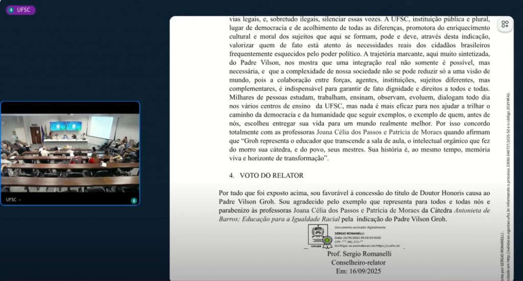 O Conselho Universitário (CUn) da Universidade Federal de Santa Catarina (UFSC) realizou na tarde desta terça-feira, 30 de setembro, sessão especial dedicada à apreciação da concessão do título de Doutor Honoris Causa ao padre Vilson Groh. O nome do homenageado foi escolhido pela ampla maioria dos conselheiros pela extensa trajetória de Groh como educador popular e líder comunitário, marcada pela luta pela justiça social e pela atuação junto a comunidades vulneráveis de Florianópolis.
