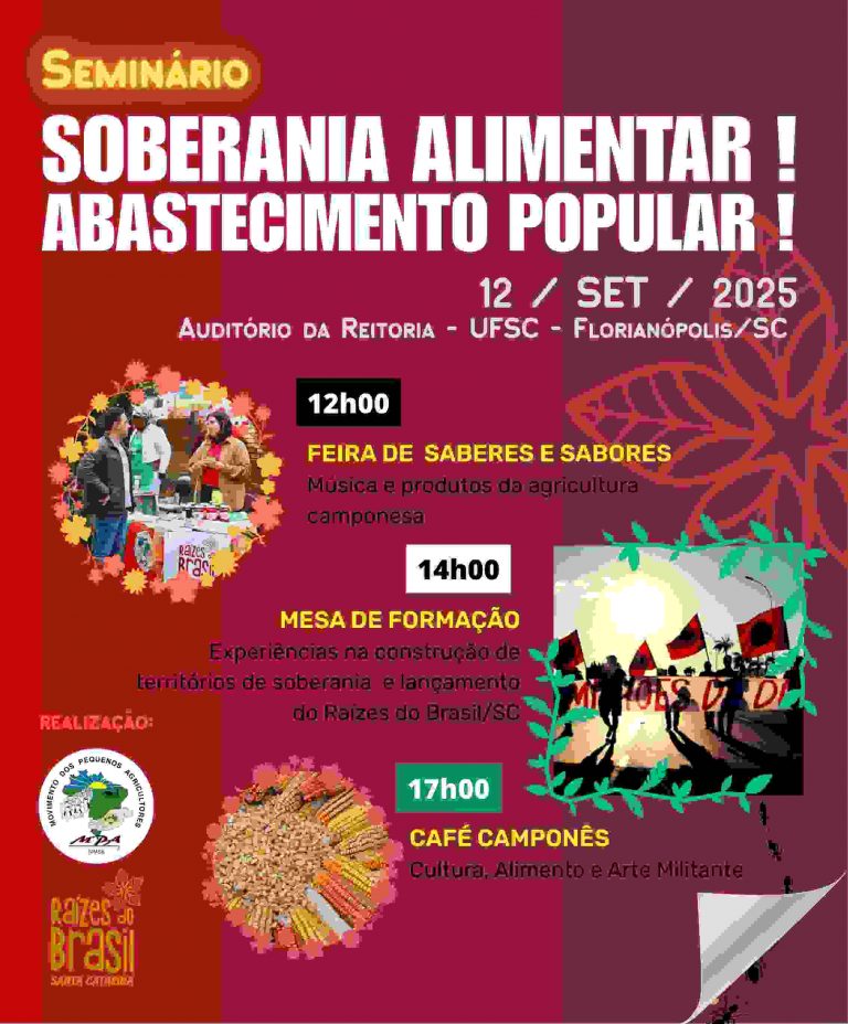 A Universidade Federal de Santa Catarina (UFSC) sediou a abertura do Seminário Soberania Alimentar e Abastecimento Popular nesta sexta-feira, dia 12 de setembro de 2025, no Auditório da Reitoria. A iniciativa do Movimento dos Pequenos Agricultores (MPA) e do Coletivo Raízes do Brasil de Santa Catarina reuniu agricultores, pesquisadores, estudantes e representantes de movimentos sociais para debater alternativas de produção e distribuição de alimentos em tempos de crise climática e insegurança alimentar. Segundo a organização, a proposta do seminário é reforçar que “comer é um ato político” e que a agricultura camponesa é um caminho fundamental diante desses desafios.