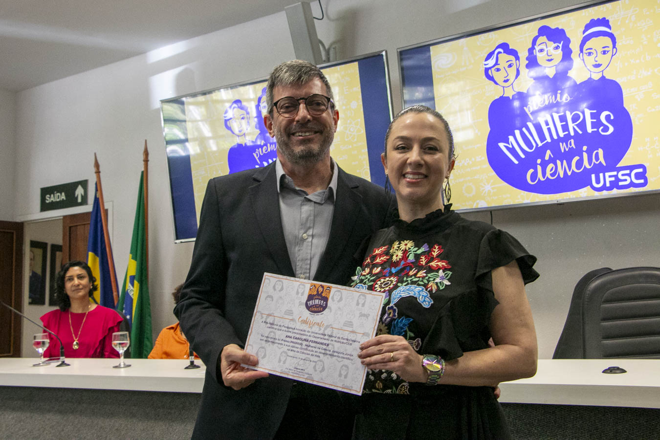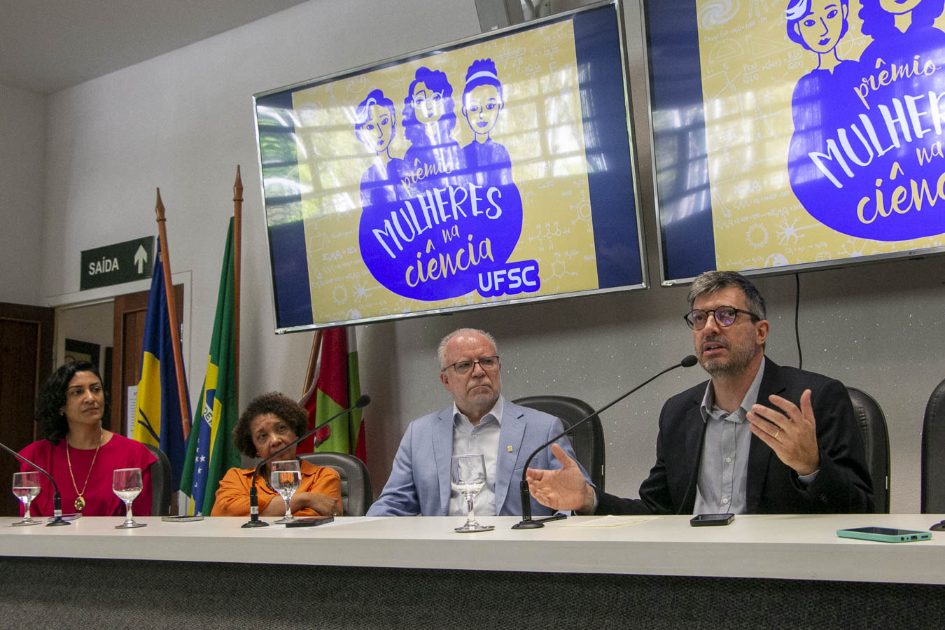 O evento contou com as presenças e falas do reitor, Irineu Manoel de Souza; da vice-reitora, Joana Célia dos Passos; do pró-reitor de Pesquisa e Inovação (Propesq), Jacques Mick; e da pró-reitora de Ações Afirmativas e Equidade (Proafe), Leslie Sedrez Chaves — lideranças que também entregaram os diplomas às homenageadas do dia. A participação da gestão da UFSC simbolizou o compromisso institucional de avançar em políticas e ações concretas de valorização da ciência feita por elas.