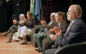 O secretário de Comunicação chamou ao palco para compor a mesa: o reitor Irineu Manoel de Souza; a pró-reitora de Extensão, Olga Regina Zigelli Garcia; o pró-reitor de Pesquisa e Inovação em exercício, William Gerson Matias; a pró-reitora de Graduação e Educação Básica, Dilceane Carraro, e o pró-reitor de Pós-Graduação, Werner Kraus.