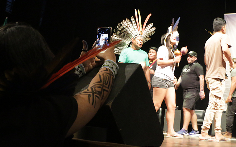 Na sequência, indígenas Xokleng fizeram uma apresentação no palco com dança e cantos utilizados em celebrações. Também falaram ao microfone convidando o público a acompanhar a programação temática indígena na Sepex 2025.
