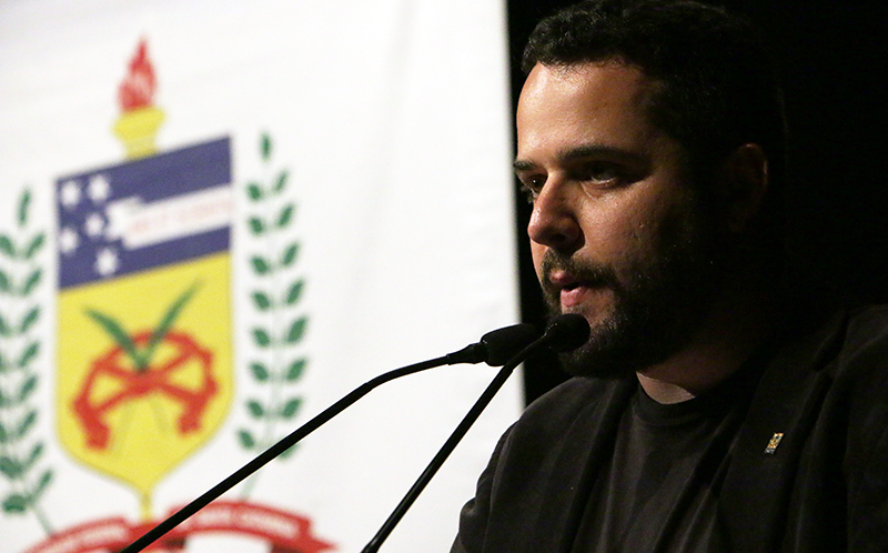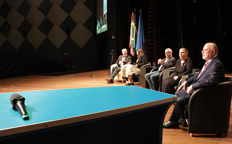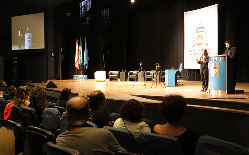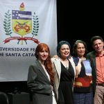 O secretário de Comunicação chamou ao palco para compor a mesa: o reitor Irineu Manoel de Souza; a pró-reitora de Extensão, Olga Regina Zigelli Garcia; o pró-reitor de Pesquisa e Inovação em exercício, William Gerson Matias; a pró-reitora de Graduação e Educação Básica, Dilceane Carraro, e o pró-reitor de Pós-Graduação, Werner Kraus.