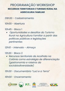A equipe realizou um estudo sobre casos de empreendimentos consolidados de Turismo Rural na Agricultura Familiar em todo o estado, destacando boas práticas das iniciativas e gargalos a serem superados. O acesso ao Programa Nacional de Fortalecimento da Agricultura Familiar (Pronaf) será pauta de debate, com análise histórica sobre investimentos na atividade e análise da legislação e assistência técnica. O assunto foi tema de uma pesquisa que será apresentada no evento.