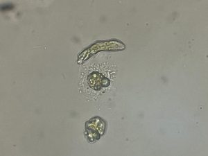 No topo uma microalga Rafidofícea e, abaixo, duas células depois de “explodidas”, liberando muco. Foto: Divulgação/UFSC