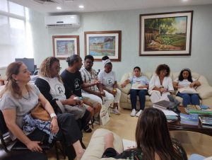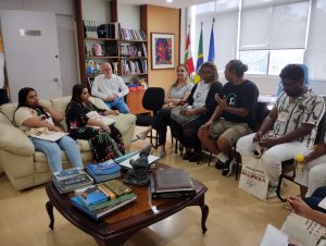 Integraram a agenda a coordenadora do curso, professora Maíra Samara de Lima Freire, do Departamento de Antropologia da UFSC, e Vanda Pinedo, representante do MNU, professora aposentada da rede estadual e docente na Educação Quilombola na modalidade EJA. O grupo foi recebido no Gabinete da Reitoria e, na sequência, iria visitar pró-reitorias estratégicas, em diálogo sobre a consolidação do curso – recém-implantado em formato EaD, com atividades presenciais no território.