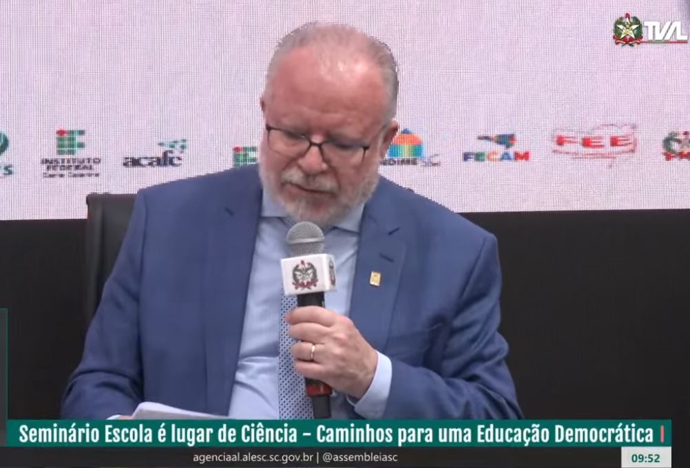 Durante sua fala, o reitor Irineu destacou que o seminário reúne representantes do sistema educacional catarinense, incluindo universidades estaduais, a UFSC, institutos federais e fóruns de educação, formando uma ampla rede de cooperação interinstitucional. Ele enfatizou que o principal objetivo do evento é fomentar a educação científica e incentivar a formação de jovens cientistas desde as etapas iniciais da vida escolar. Relembrando que a primeira edição do seminário aconteceu em 2019, Irineu sublinhou que, este ano, a meta é fortalecer e reativar o programa Escola é Lugar de Ciência, articulando escolas públicas, universidades e o poder legislativo para debater temas como pesquisa científica, extensão universitária e educação básica. O reitor também ressaltou a relevância do seminário para o fortalecimento de políticas educacionais e a identificação de boas práticas que impulsionem avanços na área. Ele destacou a trajetória da UFSC como protagonista nos debates sobre educação e sua contribuição para o desenvolvimento do novo Plano Nacional de Educação (PNE), atualmente em discussão, reafirmando o papel estratégico da instituição no cenário estadual e nacional.