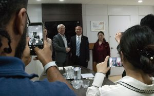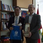 Representantes da universidade chinesa visitaram, nesta quarta-feira, o Campus de Florianópolis, no bairro Trindade, acompanhados de equipe da Secretaria de Relações Internacionais (Sinter). No final da manhã, a comitiva posou para fotos em frente ao mural da Reitoria e subiu ao gabinete para assinar o convênio.