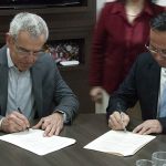 Professor Werner Krauss e professor Gu Chunhua, presidente da SUEP, apertam as mãos depois de assinado o termo. Foto: Salvador Gomes/Agecom/UFSC