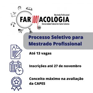 O Programa de Pós Graduação em Farmacologia da Universidade Federal de Santa Catarina (UFSC) está com inscrições abertas para o mestrado profissional até 27 de novembro. São ofertadas 13 vagas voltadas para graduados nas áreas de Ciências Biológicas e Ciências da Saúde ou qualquer profissional com formação superior. As inscrições devem ser realizadas em duas etapas, por meio do preenchimento do formulário de inscrição e, em seguida, com o envio dos documentos solicitados no edital para o e-mail mp.ppgfmc@contato.ufsc.br.