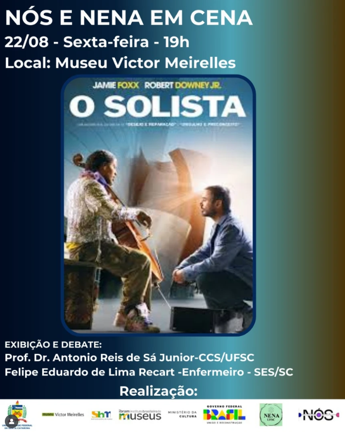 O Projeto Cine Ata-me, realizado pelo Núcleo de Estudos sobre Gênero e Sexualidade (NÓS) do Centro de Ciências da Educação da Universidade Federal de Santa Catarina (CED/UFSC), promove debates sobre saúde mental, como tema para reflexão na produção social da identidade e da diferença. A atividade ocorre no Museu Victor Meirelles, no Centro de Florianópolis. Serão cinco sessões de cinema e debates às sextas-feiras, com a primeira ocorrendo em 22 de agosto, das 19h às 22h, com a exibição do filme O Solista (2009), de Joe Wright.