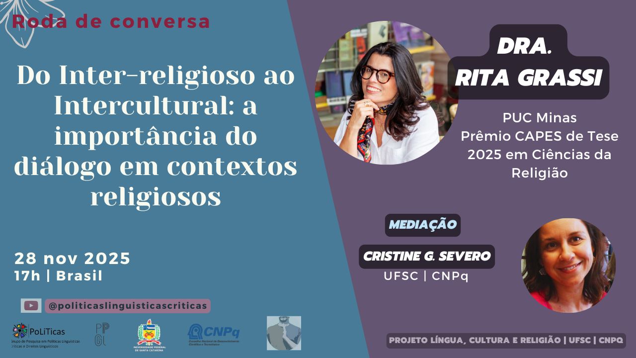 O Grupo de Políticas e Direitos Linguísticos (PoLiTicas), do Programa de Pós-Graduação em Linguística da Universidade Federal de Santa Catarina (UFSC), promove o debate Do Inter-religioso ao Intercultural: a importância do diálogo em contextos religiosos, evento online com a professora Rita Grassi. A atividade será no dia 28 de novembro, às 17h.
