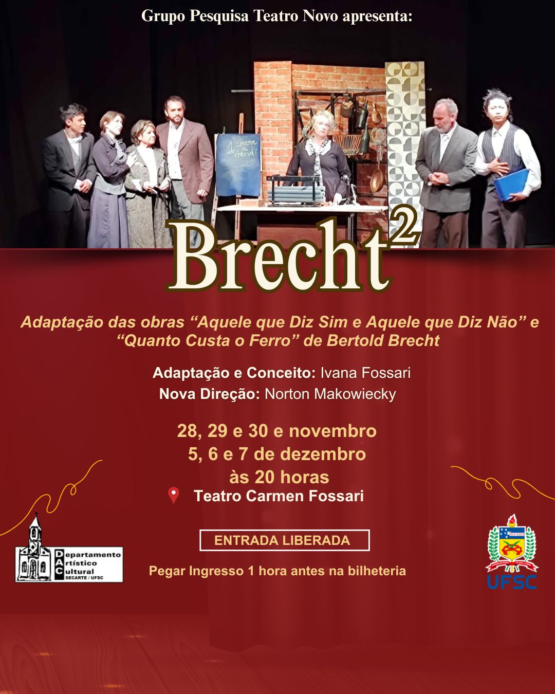 O Grupo Pesquisa Teatro Novo apresenta nos dias 28, 29 e 30 de novembro e 5, 6 e 7 de dezembro, às 20h, no Teatro Carmen Fossari da Universidade Federal de Santa Catarina (UFSC), o espetáculo Brecht 2. A entrada é gratuita, e o público deve retirar o ingresso na bilheteria do teatro uma hora antes do início da apresentação.