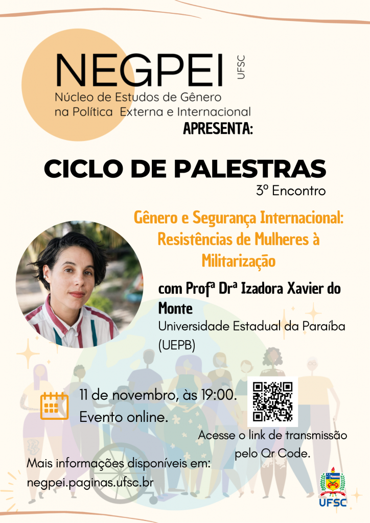 O Núcleo de Estudos de Gênero na Política Externa e Internacional (Negpei) da Universidade Federal de Santa Catarina promove o terceiro encontro do Ciclo de Palestras em 11 de novembro, terça-feira, às 19h. O Ciclo de Palestras é formado por uma série de eventos mensais que abordam temas relacionados aos Estudos de Gênero e Relações Internacionais. As palestras são ministradas por pesquisadoras convidadas e mediadas por membros do núcleo.