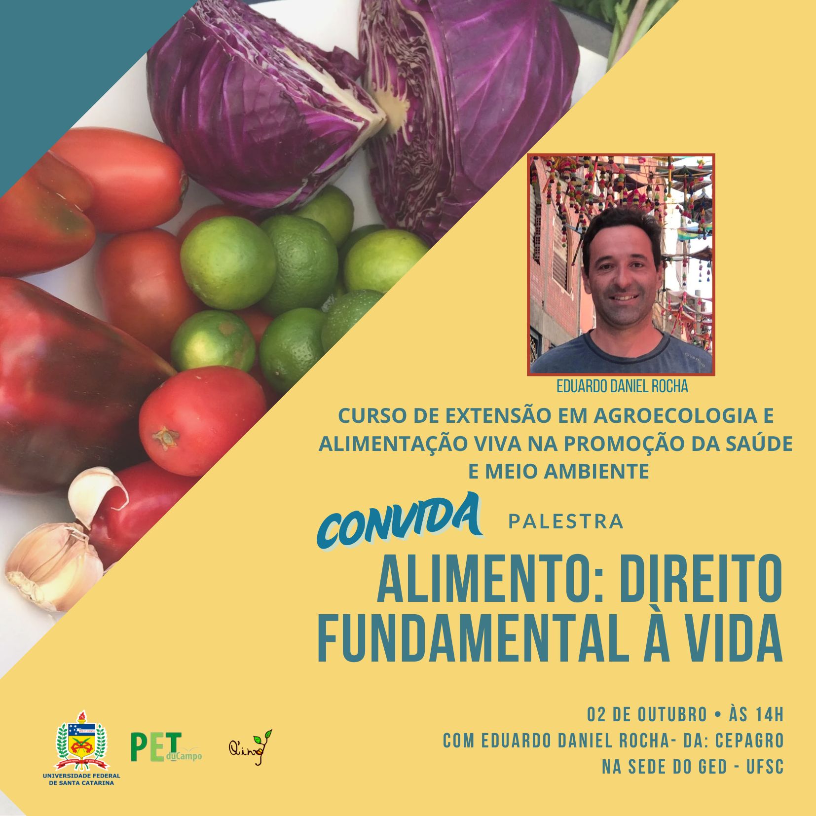 O Curso de Extensão em Agroecologia e Alimentação Viva na Promoção da Saúde realiza a palestra Alimento: Direito Fundamental à Vida na quinta-feira, 2 de outubro, às 14h, na sede do Grupo Escoteiro Desterro (GED), no campus Trindade da Universidade Federal de Santa Catarina (UFSC), em Florianópolis.