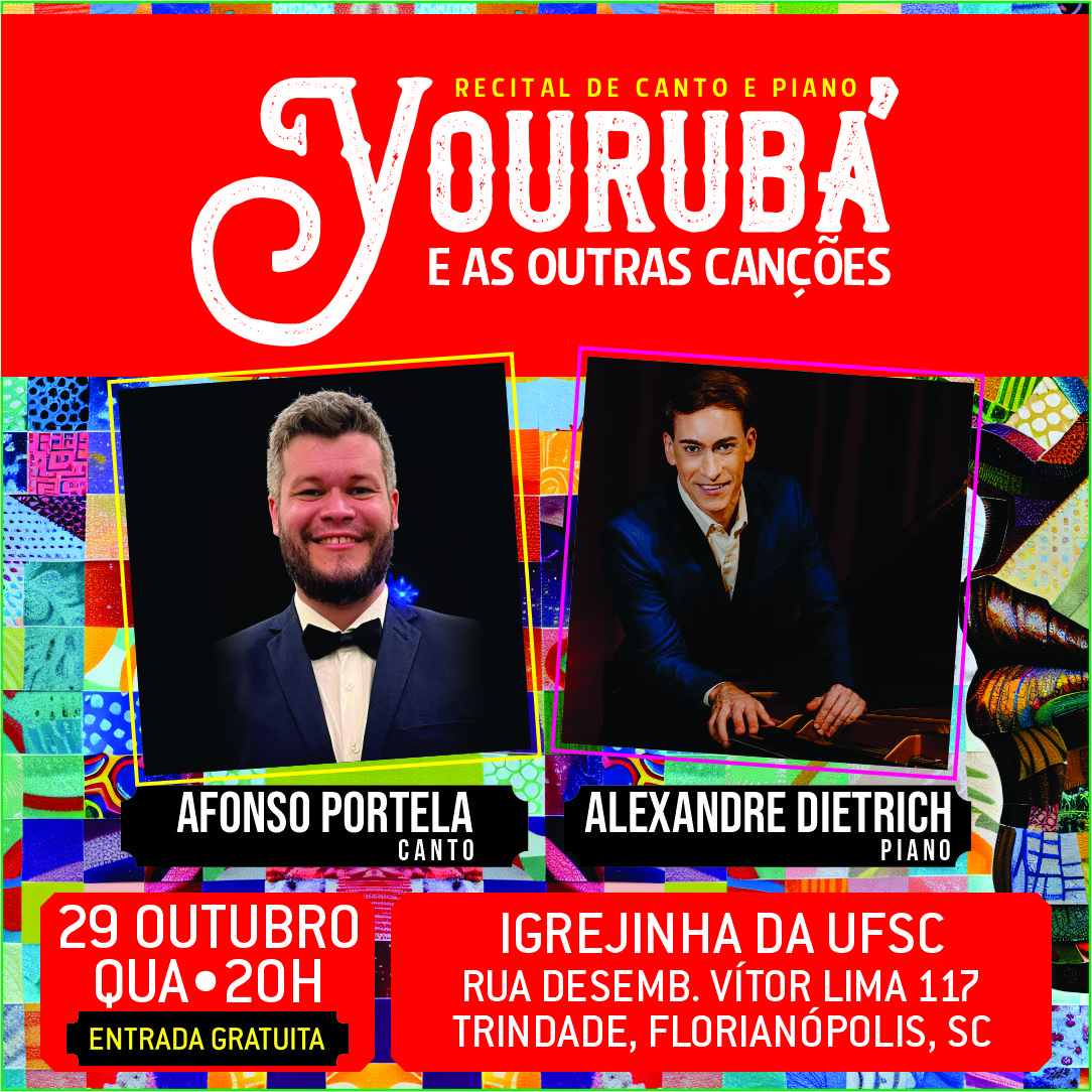 A Igrejinha da UFSC receberá o recital de canto e piano Yorubá e as Outras Canções, na quarta-feira, 29 de outubro, às 20h, com interpretação do tenor Afonso Portela e do pianista Alexandre Dietrich. A apresentação terá entrada gratuita, com o objetivo de democratizar o acesso à música erudita de canto e piano. O recital é dedicado a composições inspiradas nas matrizes culturais e musicais africanas e brasileiras, transformadas em canções para canto e piano.