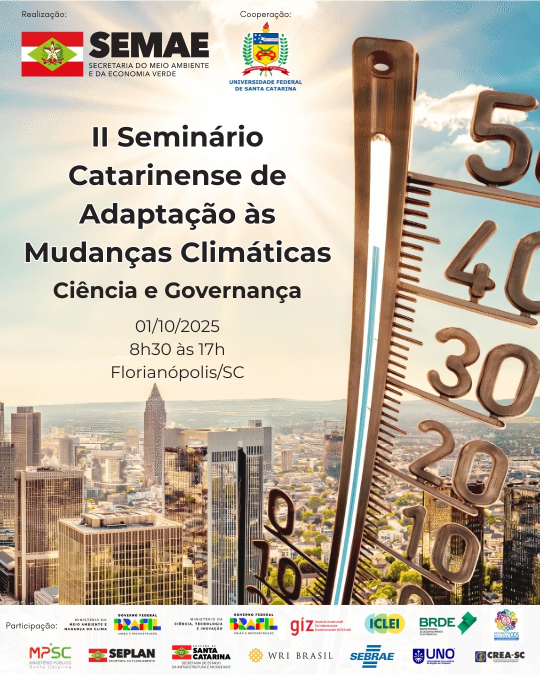A Secretaria de Estado do Meio Ambiente e da Economia Verde (Semae/SC), em cooperação com o Instituto de Mudanças Climáticas e do Laboratório de Climatologia Aplicada (LabClima) da Universidade Federal de Santa Catarina (UFSC), promove o II Seminário Catarinense de Adaptação às Mudanças Climáticas em 1° de outubro, das 8h30 às 17h, no auditório da Associação dos Municípios da Grande Florianópolis (Granfpolis), no bairro Capoeiras. A atividade é aberta ao público e tem inscrição gratuita, disponível pelo formulário on-line. Os participantes terão direito a certificado de quatro horas.