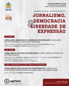 O Observatório da Ética Jornalística (objETHOS), grupo de pesquisa do Programa de Pós-Graduação em Jornalismo da Universidade Federal de Santa Catarina (UFSC) promove o Seminário Nacional Jornalismo, Democracia e Liberdade de Expressão, na sexta-feira, 26 de setembro.