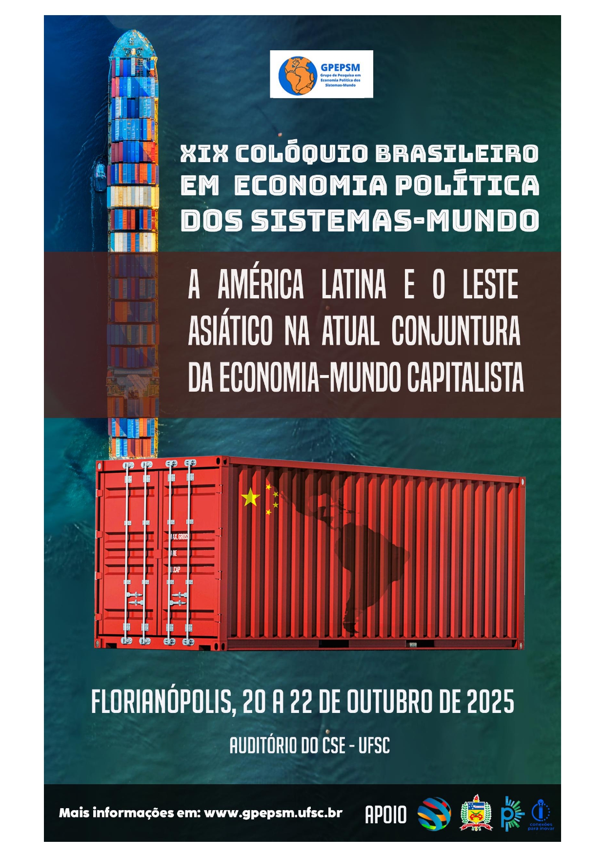 O XIX Colóquio Brasileiro em Economia Política dos Sistemas-Mundo ocorre de 20 a 22 de outubro, no auditório do Centro Socioeconômico (CSE) da Universidade Federal de Santa Catarina (UFSC), em Florianópolis. O evento é organizado pelo Grupo de Pesquisa em Economia Política dos Sistemas (GPEPSM) do Programa de Pós-Graduação em Relações Internacionais (PPGRI), e o tema será A América Latina e o Leste Asiático na atual conjuntura da economia-mundo capitalista.