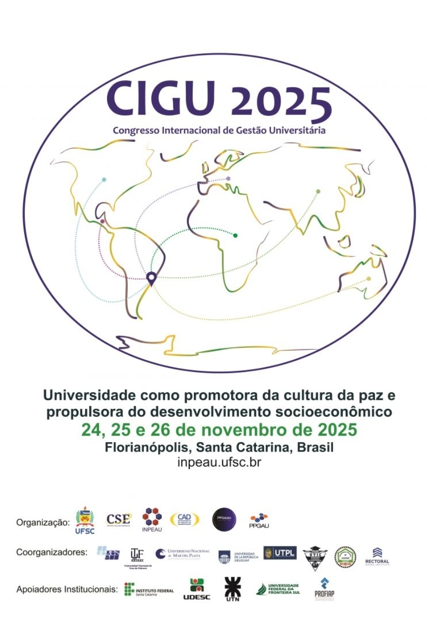 A Universidade Federal de Santa Catarina (UFSC), por meio do Instituto de Pesquisas e Estudos em Administração Universitária (INPEAU), promove o XXIV Congresso Internacional de Gestão Universitária (CIGU 2025), que ocorrerá de 24 a 26 de novembro, em Florianópolis (SC), nas dependências do Majestic Palace Hotel.