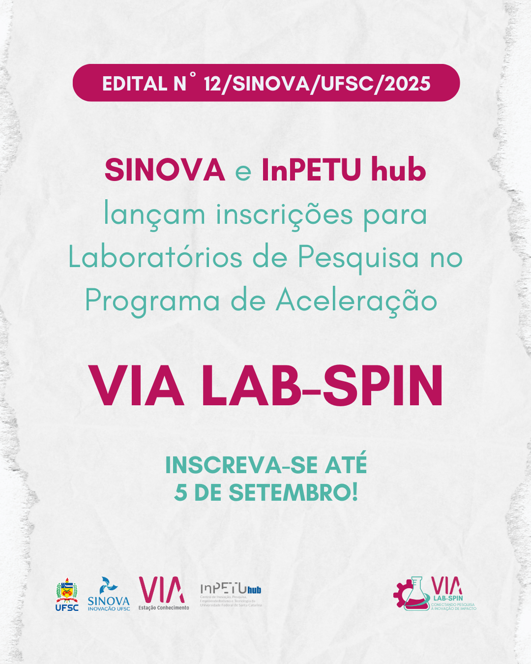 O Departamento de Inovação (Sinova) e o Centro de Inovação, Pesquisa, Empreendedorismo e Tecnologia (InPETU hub) da Universidade Federal de Santa Catarina (UFSC) abriram inscrições para a seleção de laboratórios de pesquisa para o Programa de Aceleração VIA LAB-SPIN. Podem se inscrever até 5 de setembro laboratórios de pesquisa formalmente constituídos no âmbito da UFSC.