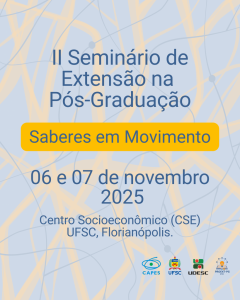 O Programa de Extensão na Pós-Graduação (Proext-PG) da Universidade Federal de Santa Catarina (UFSC), em parceria com a Universidade do Estado de Santa Catarina (Udesc), realiza nos dias 6 e 7 de novembro o II Seminário de Extensão na Pós-Graduação – Saberes em Movimento. O evento ocorre no Centro Socioeconômico (CSE) da UFSC, no campus Trindade, em Florianópolis, das 8h às 18h.