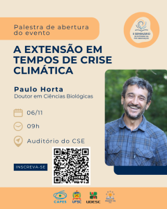 A abertura do seminário, marcada para as 9h do dia 6 de novembro, contará com um momento especial: a conferência do professor Paulo Horta, da UFSC, transmitida diretamente da 30ª Conferência das Nações Unidas sobre as Mudanças Climáticas (COP-30). A participação do pesquisador no maior evento global sobre mudanças climáticas oferece uma oportunidade única para debater a extensão universitária em tempos de crise climática, além de abordar a importância e os desafios da extensão na pós-graduação. A COP-30 ocorre entre 10 e 21 de novembro de 2025, em Belém (PA), sendo a primeira vez que o Brasil sedia a conferência.
