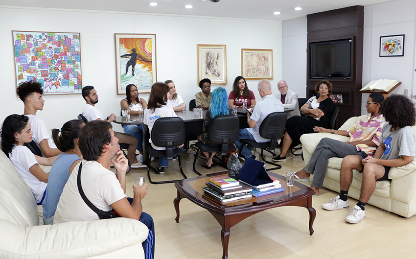Os alunos aprovados no Vestibular Unificado UFSC/IFSC/IFC 2024 que fizeram parte da primeira turma do curso pré-vestibular gratuito Vestiba+ foram recebidos pela Universidade Federal de Santa Catarina (UFSC), na quarta-feira, 31 de janeiro. O encontro aconteceu no Gabinete da Reitoria, no Campus de Florianópolis, e buscou recepcionar os primeiros alunos que vão ingressar na Universidade por essa parceria entre a Prefeitura Municipal de Florianópolis e a UFSC. A reunião se iniciou com uma fala do reitor, Irineu Manoel de Souza, dando boas-vindas aos 5 dos 12 aprovados do Vestiba+ que estiveram presentes.