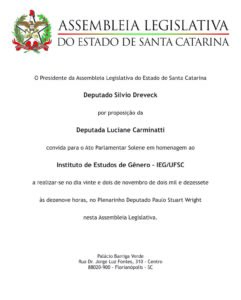 A aula magna ocorreu no auditório Garapuvu, do Centro de Cultura e Eventos, na noite de terça-feira (15). Estiveram presentes a reitora Roselane Neckel, a vice-reitora Lúcia Helena Martins-Pacheco, e a pró-reitora de pós-graduação Joana Maria Pedro, que presidiu a mesa.
