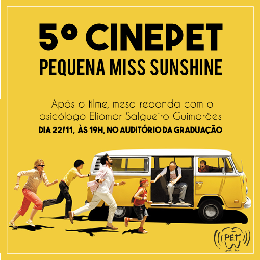 O PET Odonto-Fono (Programa de Educação Tutorial da Odontologia e Fonoaudiologia) irá apresentar o filme Pequena Miss Sunshine (2006) na quarta-feira, 22 de novembro, às 19h. Após a exibição, haverá discussão com o psicólogo Eliomar Salgueiro Guimarães.